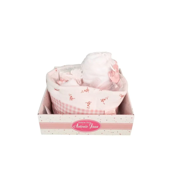 Biało - różowy miękki koszyczek w modną kratkę z akcesoriami dla lalki to wyjątkowa zabawka z kolekcji lalki hiszpańskie Antonio Juan. Została zaprojektowana dla dzieci w wieku do 3 lat, wykonana w całości w Hiszpanii.