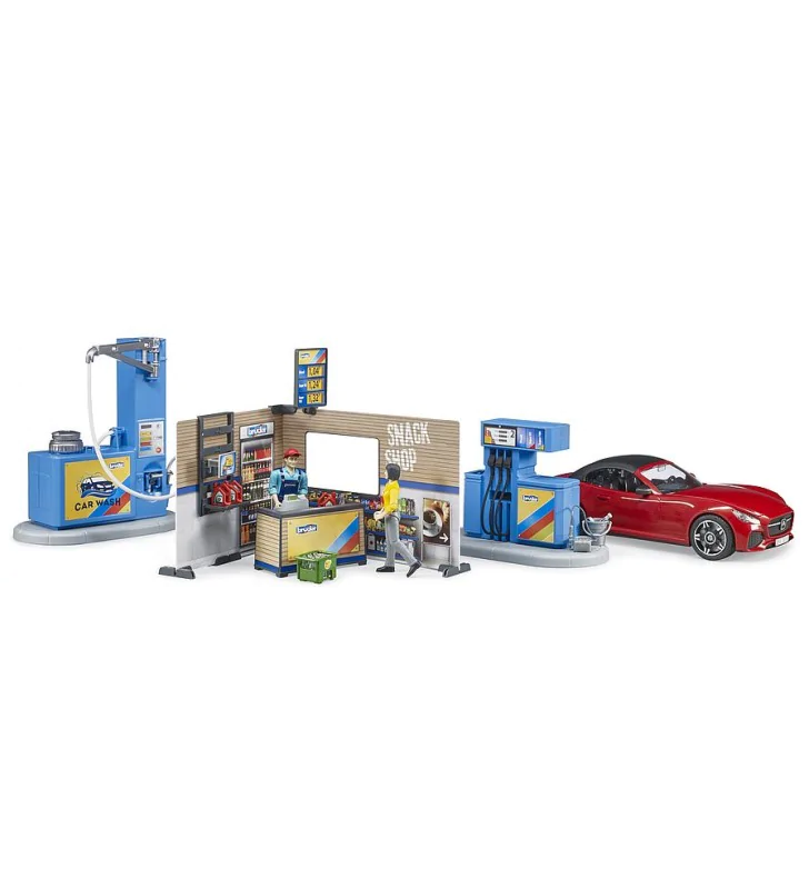 W całości zestaw posiada szereg funkcjonalności, dzięki którym dzieci poznają wszystkie czynności które wykonywane są na kompleksowych stacjach benzynowych. Dystrybutor posiada ruchome węże dzięki którym możemy zatankować auto, oraz podstawowe akcesoria do czyszczenia samochodu. W celu dokładnego umycia auta udajemy się na profesjonalną myjnię w której zamontowany wąż na ruchomym ramieniu pozwala na umycie całego auta. Na stacji czeka na nas kasjer który wystawi nam rachunek, a w razie potrzeby pomoże w obsłudze dystrybutora oraz myjni.