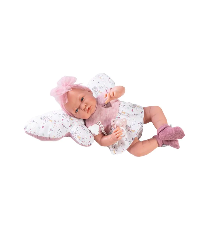 Dziewczynka ubrana jest w sukienkę odciętą w talii, łączoną z dwóch materiałów. Górę kreacji tworzy przyjemna w dotyku dzianina, a dół tkanina ozdobiona kolorowym wzorem. Dopełnieniem całej stylizacji są bufiaste majteczki o takim samym wzorze co dół kreacji oraz dzianinowe skarpetki z przyszytymi szarymi kokardkami. Aby wygodne było leżakowanie lalę wyposażono w podusię w kształcie skrzydełek motyla. Dodatkową atrakcją zestawu będzie również smoczek na łańcuszku z zawieszką misia. Dołączone akcesorium pozwoli na odgrywanie scenek z grymaszącym maluszkiem.