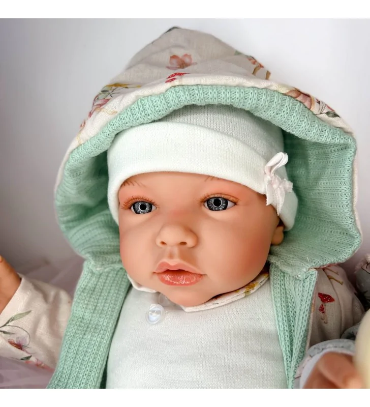 Pięknie ręcznie wykonany bobas 1214 pochodzi z hiszpańskiej kolekcji marki Marina & Pau. Dziewczynka o imieniu Ane Mint ma 45 cm wysokości. Lalka wizualnie przypomina prawdziwego bobasa. Dziewczynka nie ma włosów, a jedynie żłobienia wyglądające niczym jak u noworodka.