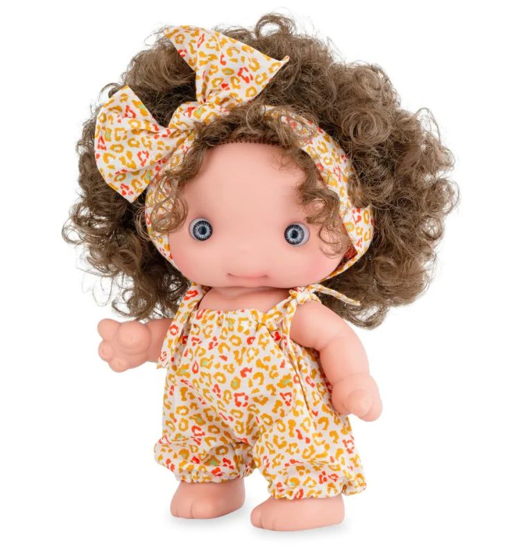Urocze 25-centymertowe lalki hiszpańskie z kolekcji Piu to wyjątkowa propozycja od firmy Marina & Pau. Oryginalnie zaprojektowany model 1418 został wykonany z miękkiego, przyjemnego w dotyku winylu. Wyróżnia się uproszczoną mimiką twarzy oraz większą głową z gęstymi, kręconymi włosami. Zwracają uwagę niebieskie oczy, mały nosek i lekko uśmiechnięta buzia. Dziewczynka posiada wyraźnie zaznaczony pępek. Głowa oraz kończyny są ruchome, dzięki czemu można ułożyć ją w dowolnej pozycji.