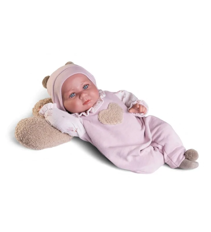 Lalka hiszpańska Luca 33370 posiada wysokiej jakości stylowe, ręcznie szyte ubranka i atrakcyjne akcesoria w kolorze pudrowego różu i beżu: