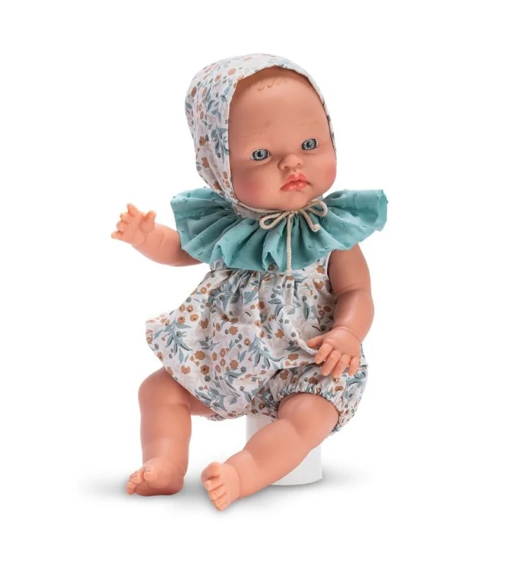 Wykonany z gładkiego, bezpiecznego winylu bobas o imieniu Alex zachwyca oryginalnie zaprojektowanym strojem w modny motyw roślinny. Delikatny wzór rampersa idealnie komponuje się z falbankowym kołnierzykiem w kolorze zielonym. Całość outfitu uzupełnia wiązana, bawełniana czapeczka. Wszystkie ubranka można zdjąć, a lalę przebrać lub wykąpać. Lalka hiszpańska znanej marki ASI ma 36 cm wysokości. Polecamy ją dzieciom w wieku od 3 lat.