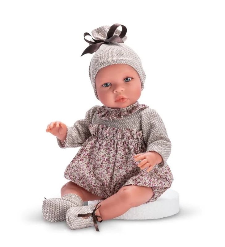 Lalka hiszpańska marki ASI ubrana jest w wysokiej jakości, stylowy rampers z długim rękawem, czapeczkę oraz ozdobne miękkie buciki. Strój uszyto z dwóch rodzajów materiałów: beżowej bawełny w różową łączkę oraz nieco grubszej, kakaowej tkaniny o delikatnej fakturze. Finezji dodaje falbanka oraz lśniące tasiemki z czekoladowej satyny. Wszystkie części garderoby można z łatwością zdjąć. Bobas zapakowany jest w eleganckie różowo-białe pudełko firmowe z wieczkiem. Leo posiada wszystkie wymagane certyfikaty bezpieczeństwa CE i wyprodukowany jest w całości w Hiszpanii. Do kompletu proponujemy nosidełko oraz wózek z kolekcji akcesoriów ASI Martina.