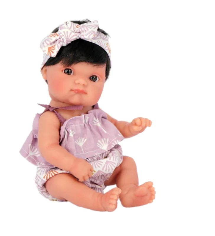 Noworodek z włosami od firmy Antonio Juan to niewielka laleczka o wysokości 21 cm. Mufly ma krótkie czarne włoski z grzywką. Uroku dodają jej duże, brązowe oczka, błyszczące usta i zaróżowione policzki. Oczy zostały namalowane ręcznie i nie zamykają się. Lalka w najmniejszym detalu została odwzorowana jak prawdziwa dziewczynka. Dodatkowo Mufly ma zaznaczoną płeć. Zabawka ze względów bezpieczeństwa przeznaczona jest do zabawy dla dzieci od 2 roku życia.