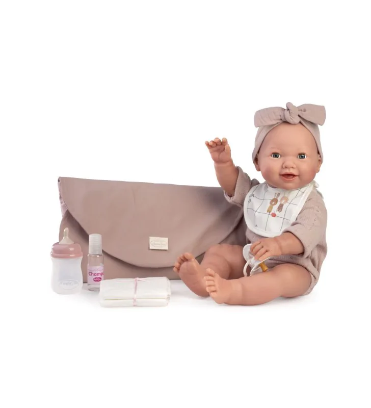 W komplecie z siusiającą lalką hiszpańską znajdują się atrakcyjne akcesoria: butelka na wodę, przewijak który można złożyć w torebkę, 2 pieluszki, smoczek na łańcuszku z klipsem.