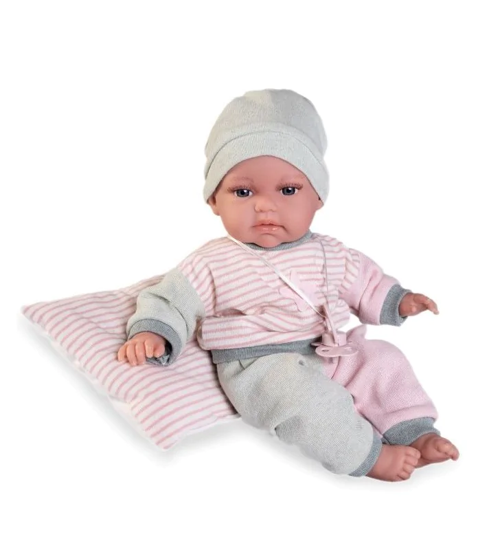 Realistycznie wyglądająca, winylowa dziewczynka z miękkim brzuszkiem posiada wyrzeźbione włoski oraz delikatnie malowane brwi, usta, paznokcie i fałdki. Toneta od marki Antonio Juan ubrana jest w mięciutką, ciepłą, dwuczęściową piżamkę w różowo-szarej kolorystyce. Strój uzupełnia czapeczka.