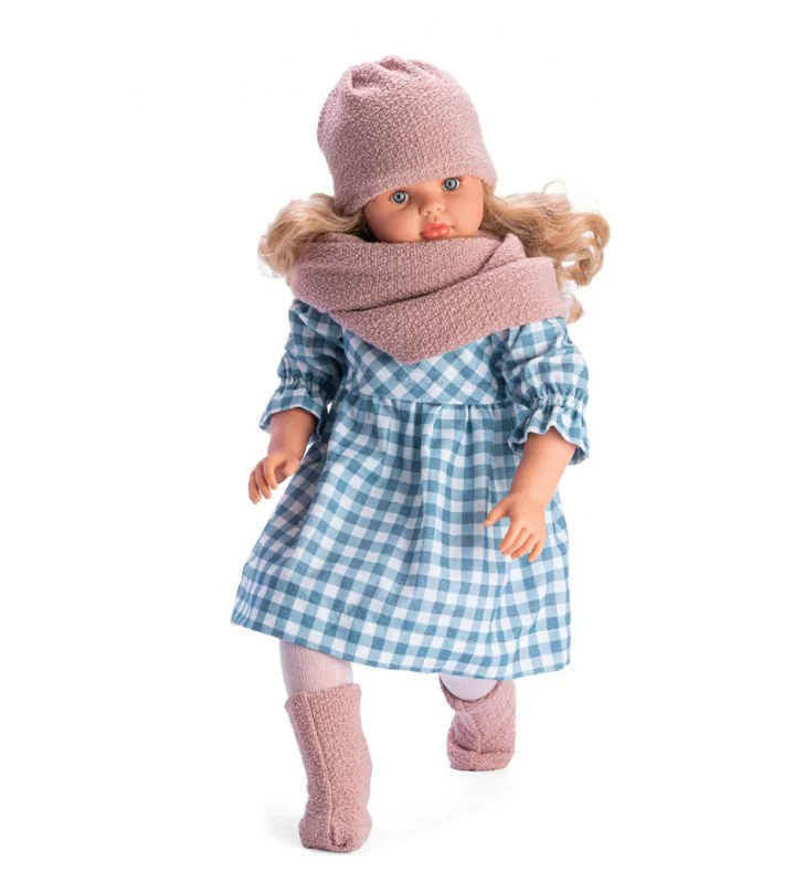 Pepa ubrana jest w niebieską sukienkę w kratkę z rękawkiem na 3/4. Kreacja odcinana jest w talii, a zakończenie rękawków stanowią gumeczki, dzięki, którym jeszcze lepiej dopasowują się do dłoni laleczki. Kolejnymi elementami ubioru dziewczynki będzie wsuwana czapka i komin. Oba dodatki są różowe i wykonane zostały z dzianiny. Pepa na nóżkach ma białe rajstopki oraz dłuższe, ciepłe buciki wykonane z dzianiny. Dziewczynka podczas zabawy może zdjąć wszystkie ubranka i bawić się w przebieranie lali.
