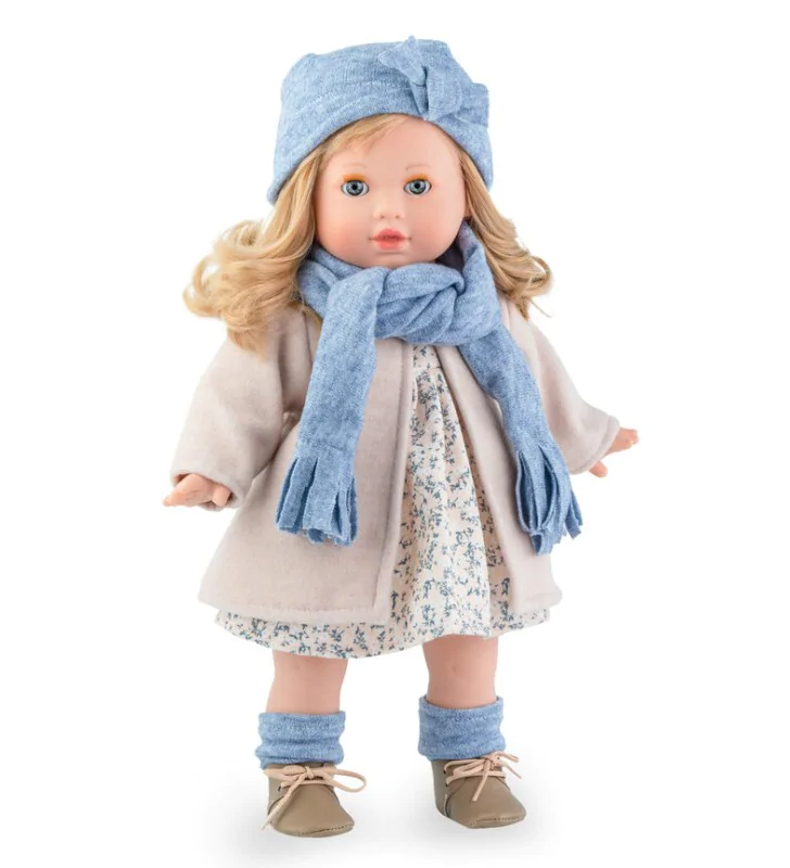 Dziewczynkę ubrano w pastelową stylizację. Tina ma na sobie morelową sukienkę zdobioną drobnymi kwiatuszkami oraz elegancki płaszczyk. Nóżki lali zdobią dłuższe, niebieskie wełniane skarpetki i wiązane brązowe buciki, a jej główkę otula przyjemna w dotyku materiałowa czapeczka. Wszystkie dodatki można zdjąć i ubierać na nowo lalę :)