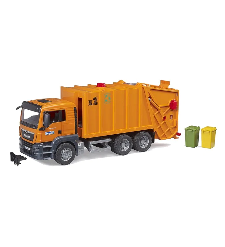 Pomarańczowa śmieciarka marki MAN TGS BR 03760 z tylnym załadunkiem uzupełnia kolekcję pojazdów dbających o porządek. Ten samochód ciężarowy przybliży obraz recyklingu i gospodarki odpadami. Dzięki solidnej konstrukcji i ruchomym elementom samochód wyróżnia się wieloma innowacjami na pokładzie. Odwzorowany w skali 1:16 jest przeznaczony do zabawy dla dzieci od 4 roku życia.