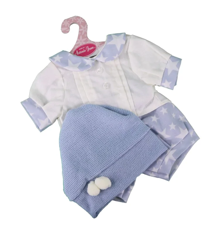 Niebieski komplet w gwiazdki to kolejny zestaw oferowany przez markę Antonio Juan, przeznaczony dla lalki o wysokości 42 cm. Komplet posiada krótki rękaw. Strój składa się z eleganckiej białej koszuli zapinanej z tyłu na rzepę oraz eleganckich bufiastych spodenek, które są gumce. Koszulę ozdabiają przyszyte guziczki oraz materiałowe zakładki umieszczone na środku ubranka. Dekorację ubranka stanowi niebieski kołnierzyk oraz mankiety z motywem w białe gwiazdki. Dodatkowo komplet wyposażono w niebieską czapkę wykonaną z dzianiny, do której przyszyte zostały dwa białe polarowe pomponiki. Dzięki posiadaniu w swojej garderobie takich dodatków kolekcja zostanie urozmaicona, a tworzone stylizacje będą coraz ciekawsze.