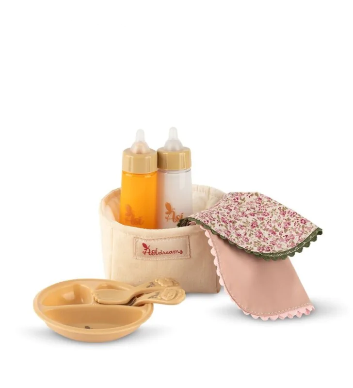 Zaprojektowany dla bobasów o wymiarach od 36 do 46 cm, zestaw akcesoriów do karmienia lalek zawiera: talerzyk, sztućce, dwa śliniaczki z różnymi nadrukami oraz dwie magiczne buteleczki: jedną z "sokiem" i jedną z "mlekiem". Wszystko znajduje się w materiałowym jasnobeżowym koszyczku, który z kolei jest zapakowany w tiulowy woreczek prezentowy. Zabawka została zaprojektowana i wyprodukowana w Hiszpanii.