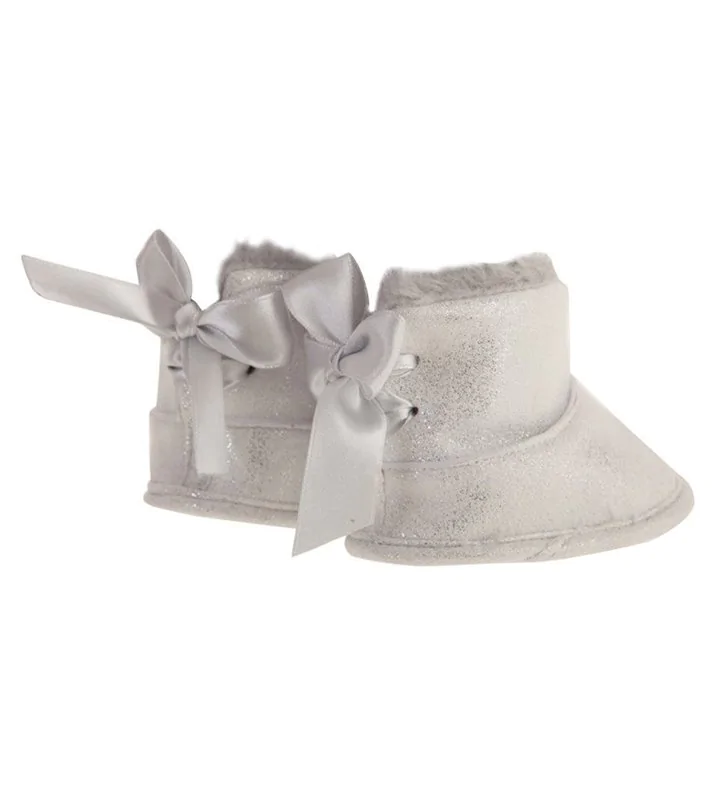 Szare buciki w środku wysłane miękkim futerkiem to kolejny dodatek, którym możesz wyposażyć swoją ulubioną laleczkę albo po prostu jako nadanie nowego wymiaru do stylizacji dziewczynki. Świetnie dopasowane obuwie sprawi, że każda stylizacja będzie doskonale się prezentować, a skomponowane buciki przydadzą się zwłaszcza w chłodniejsze dni. Urocze obuwie ozdobiono z tyłu atłasową elegancką tasiemką wiązaną w kokardkę. A samą powierzchnię obuwia ozdobiono brokatem. Uniwersalny kolor obuwia sprawi, że będziesz mógł je dopasować do każdego kompletu ubranek.