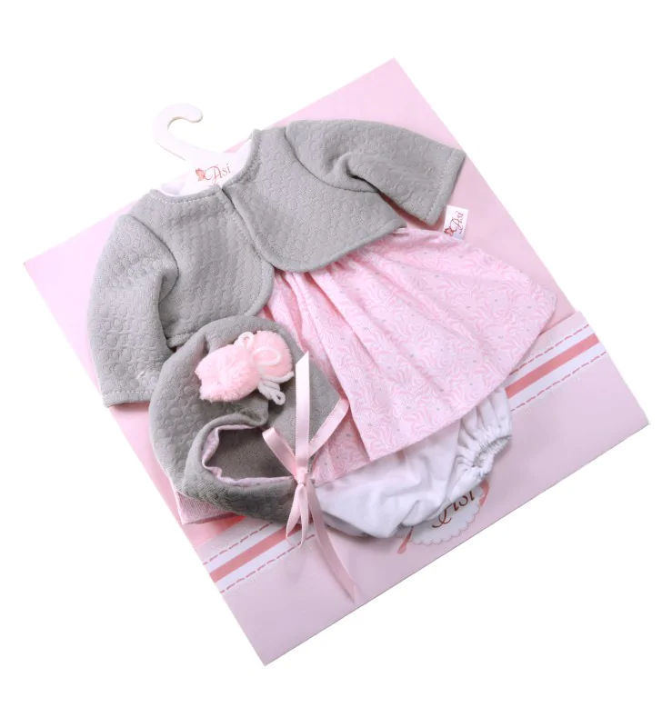 Kolejne ubranko 3404310 uzupełnia kolekcję strojów dla lalek hiszpańskiej marki ASI. Różowa sukienka jest przeznaczona dla lalki o wysokości 36 cm. Ubranko zdobi wzór w kwiaty, który nadaje mu wyjątkowego wyglądu. Sukienka jest zapinana na plecach na rzepę, co ułatwi dziecku przebieranie ulubionej lali. W komplecie znajduje się szare bolerko, którym młoda mama może okryć swoją lalę w chłodniejszy dzień. A zestaw uzupełnia czapeczka wiązana pod brodą w kolorze i kroju bolerka oraz białe, bawełniane majteczki.